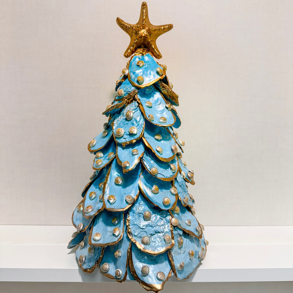 This holiday season, transform your home with our handcrafted Tiffany Blue Coastal Christmas Tree. Carefully constructed with oyster shells and small trochus seashells, this show-stopping scene adds a touch of the sea to your holiday decor.