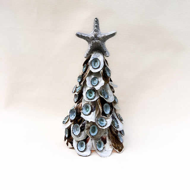 This beautiful Nautical Noel Tree is perfect for a coastal holiday celebration. Handcrafted from natural oyster shells in a white pearl finish, it's tastefully decorated with genuine turquoise limpets and a silver starfish topper. Enhance your holiday atmosphere with this unique and eye-catching piece.