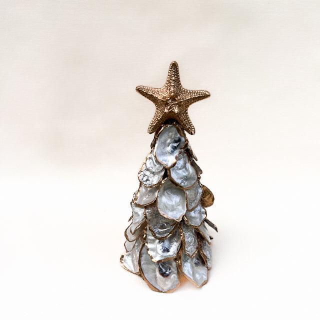 Starfish Serenity Tree is an elegant holiday tree crafted with real oyster shells and painted pearl and gold. With a starfish topper, this tree is perfect for bringing coastal charm to your holiday decor.